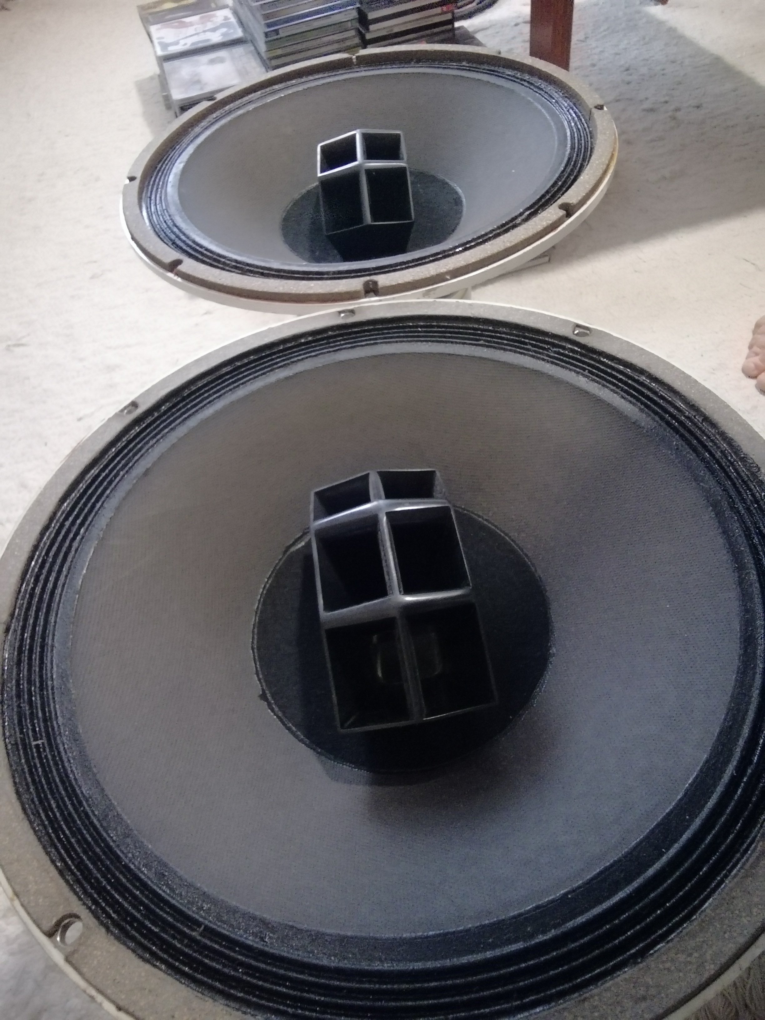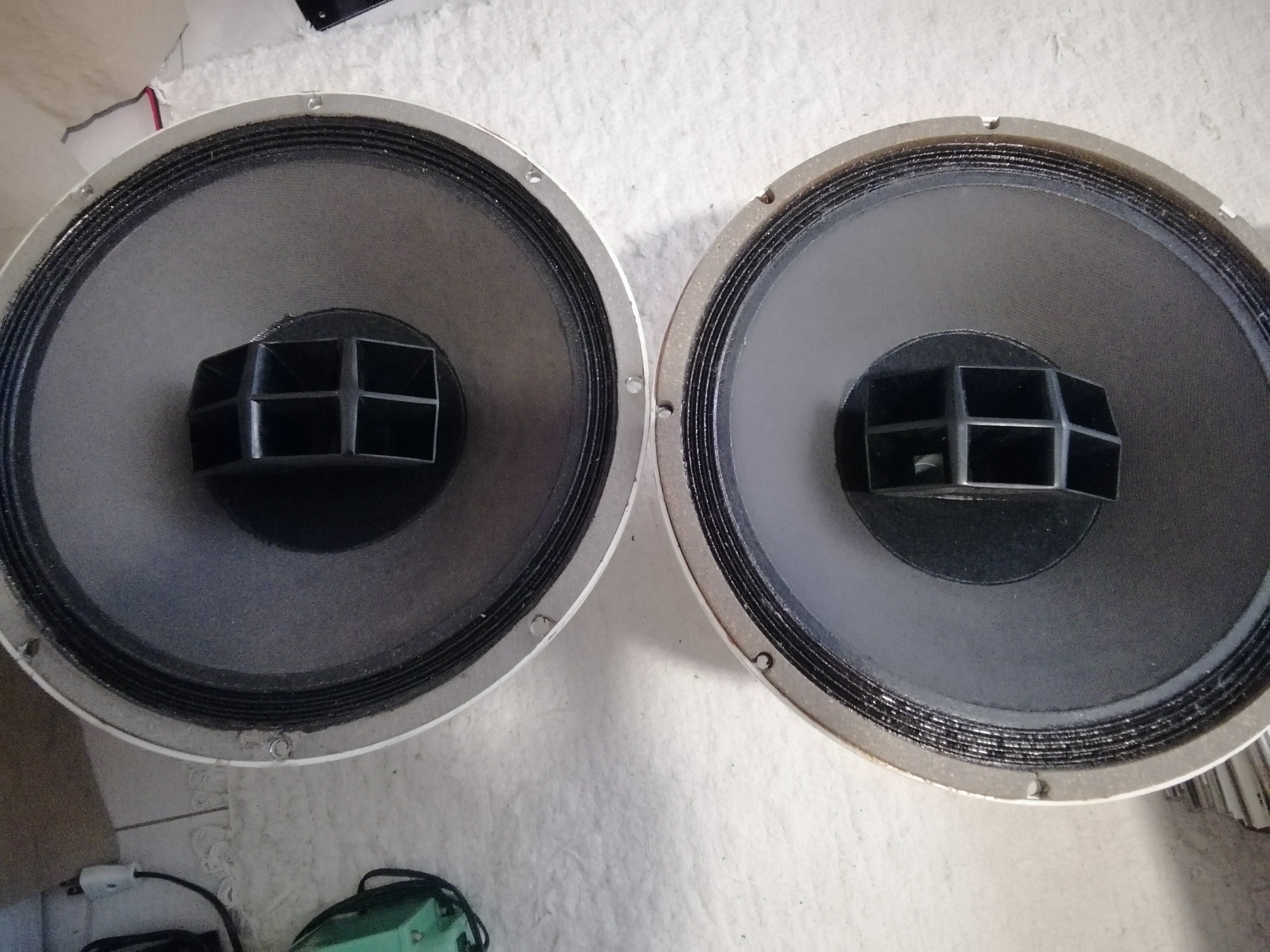 Rakok fel nehany kozelebbi kepet a hangszorokrol. Egesz jo passzban vannak, nem csak 60+ korukra tekintettel. Eredeti, gyari minden porcikajuk. Az egyiknek a feher parafa szele kicsit vastagabb, de amugy egyformak/egyforman is szolnak.
