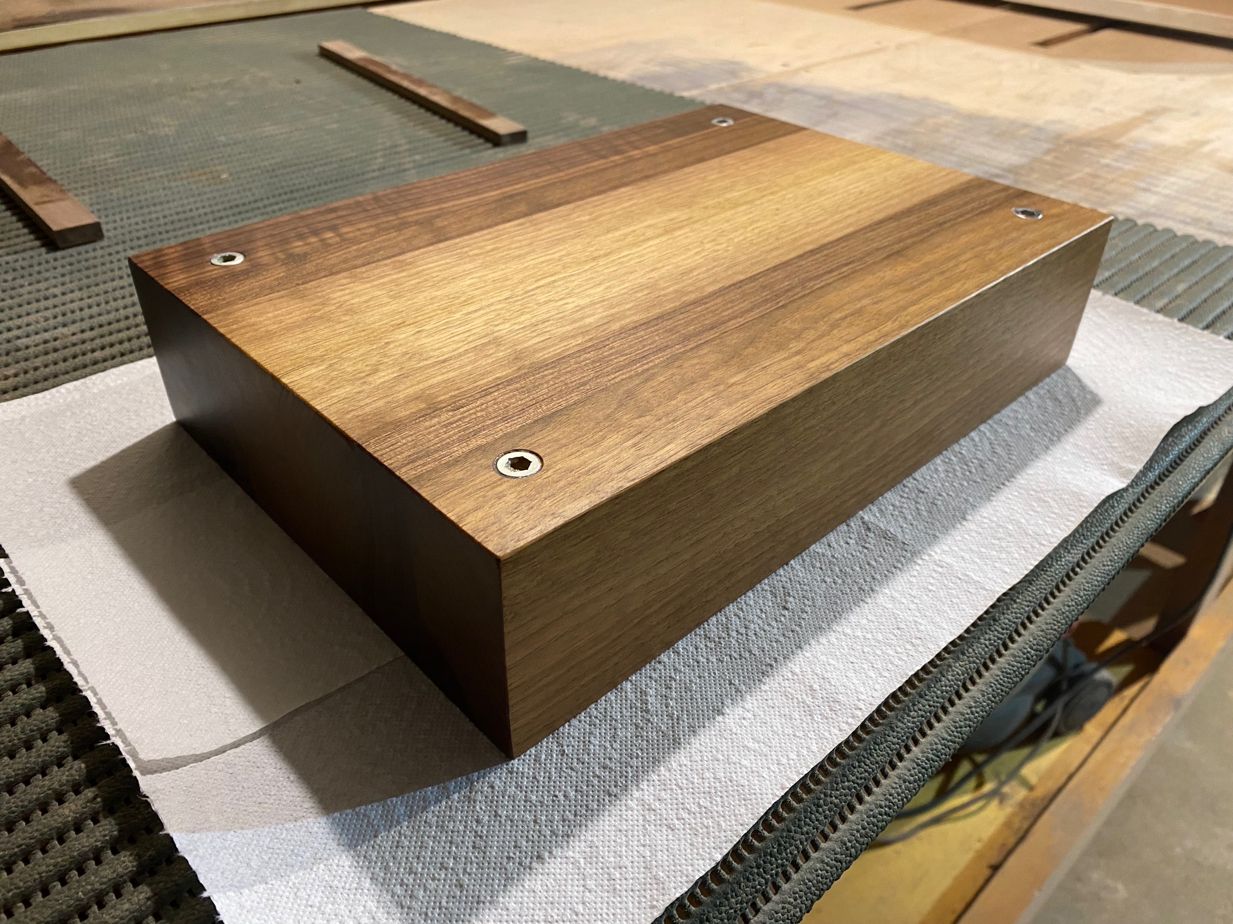 elkészült egy tömör fekete dió készülék állvány. méretek a csatolt rajzon. tömör fából készült, nincs pácolva, ez a fekete dió természetes színe olajozás után. a felső 'izolációs panel' kapott két oldalt egy merevítést, hogy a szabadon álló lap ne vetemedjen, csavarodjon. a merevítések fecskefarkú csapozással lettek rögzítve. az állvány ára 330.000.ft-ért volt.