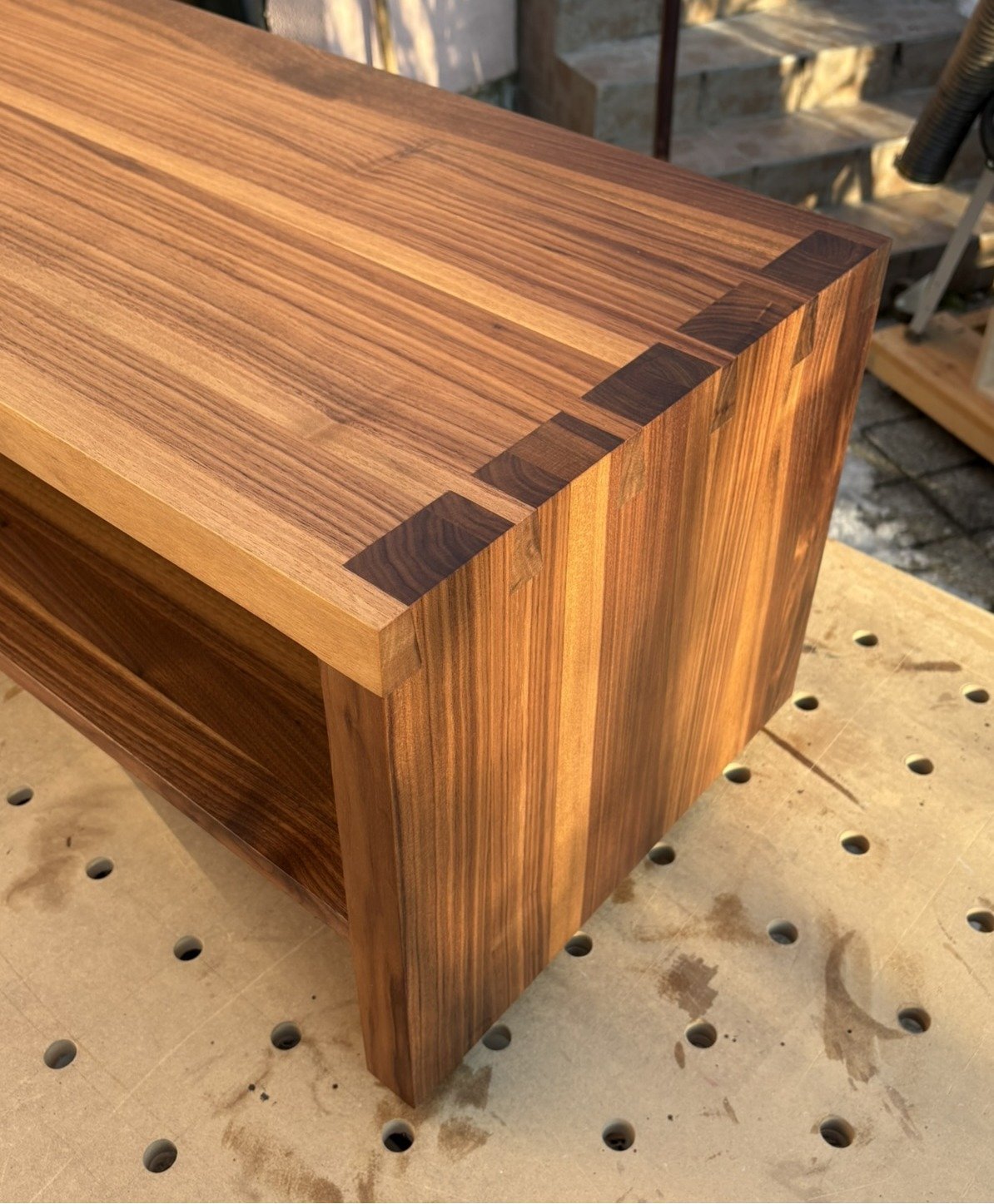 Elkészült egy TV állvány, de hifi/média állványként is megállná a helyét. Tömör amerikai dióból készült, az alsó polcot leszámítva 4cm-es anyagvastagsággal. A pontos méretek, az egyik csatolt fotón találhatóak. A súlya 35-37kg körül van, nincs pácolva, ez a fekete dió természetes színe, kemény olaj felületkezelést kapott. Az alján M6 menetes lábak/tüskék befogadására alkalmas kialakítás van. A felső illesztések, klasszikus, kézzel készített fecskefark csapozással lettek összeépítve. Az ára 525.000.ft volt.