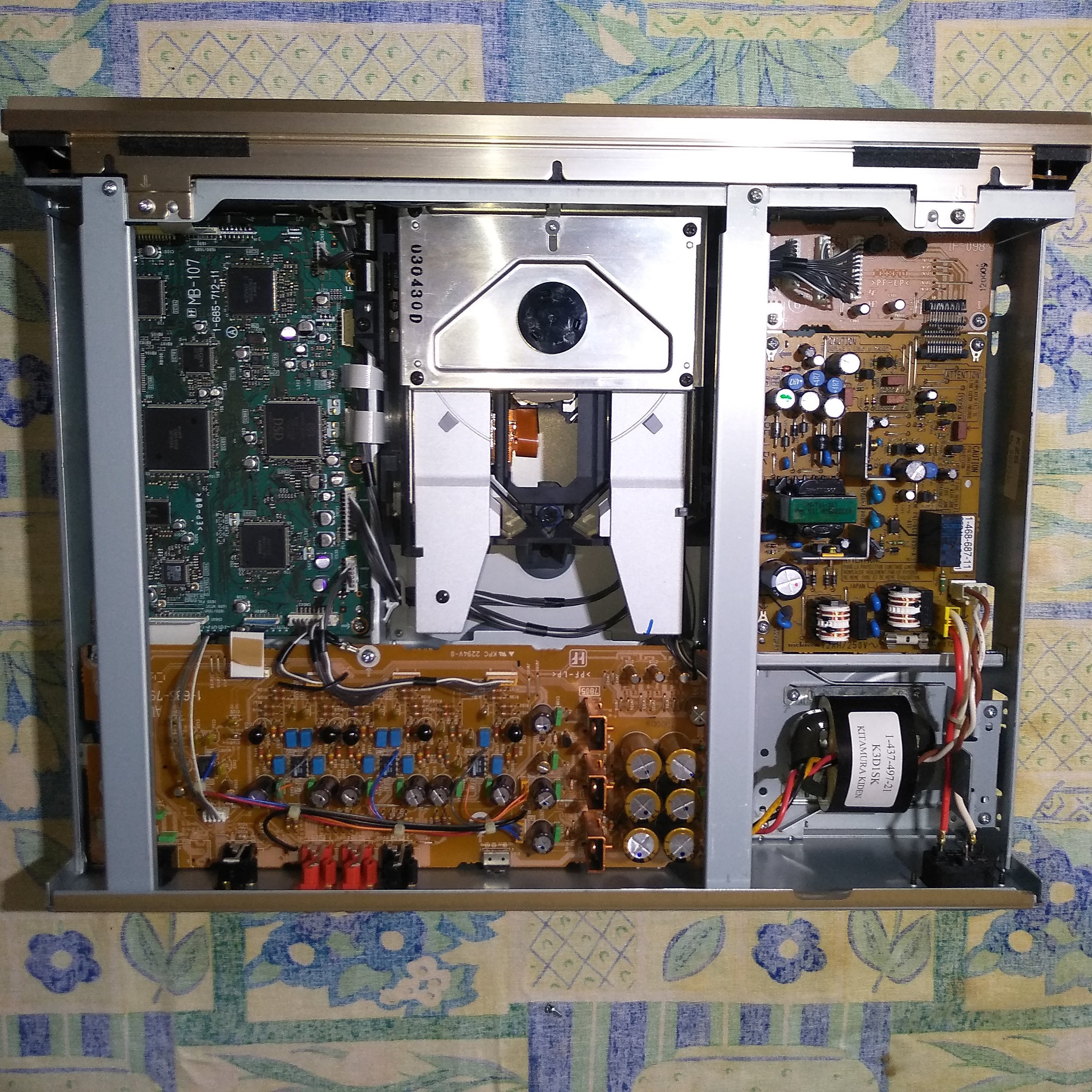 A készüléket egy jóbarátomtól vettem, gyári dobozából mi bontottuk ki. Éppen ezért nyugodtan állítom, hogy a készülék javítva, de még - a mostani fotózástól eltekintve- megbontva sem volt. Sajnos a doboza nincs meg, de a gyári táv igen. A készülék kifogástalanul müködik, (igaz a SACD olvasást lemez hiányában nem tudtam tesztelni), de CD/DVD olvasás és a távirányítója is hibátlan. Írt, újraírt lemezt is olvassa, MP3 formátumot is kezeli.