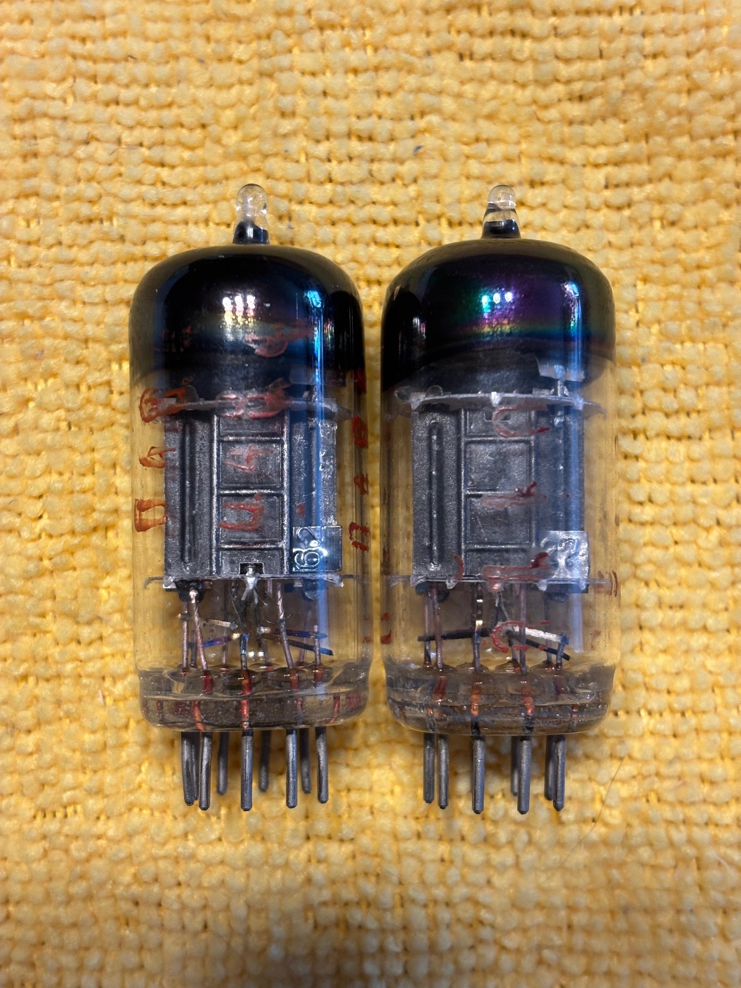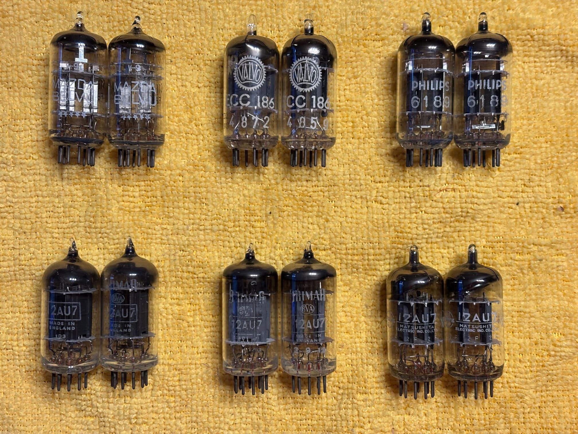 1. fotó: Telefunken ECC82, Siemens (Telefunken) ECC82, La Radiotechnique 12AU7, CBS-Hytron CHY-5814A, Raytheon JAN-CRP-5814A, Amperex (Philips) 12AU7, UNION (RFT) ECC186, Sylvania 5963, JJ ECC82 2. fotó: Cifte (Mazda) 12AU7WA-H, La Radiotechnique 12AU7WA-H, CBS 12AU7, CBS CHY-5814WA, Toshiba 5814A, Toshiba 12AU7, NEC 12AU7A, Matsushita 12AU7, General Electric 5814A Árak: