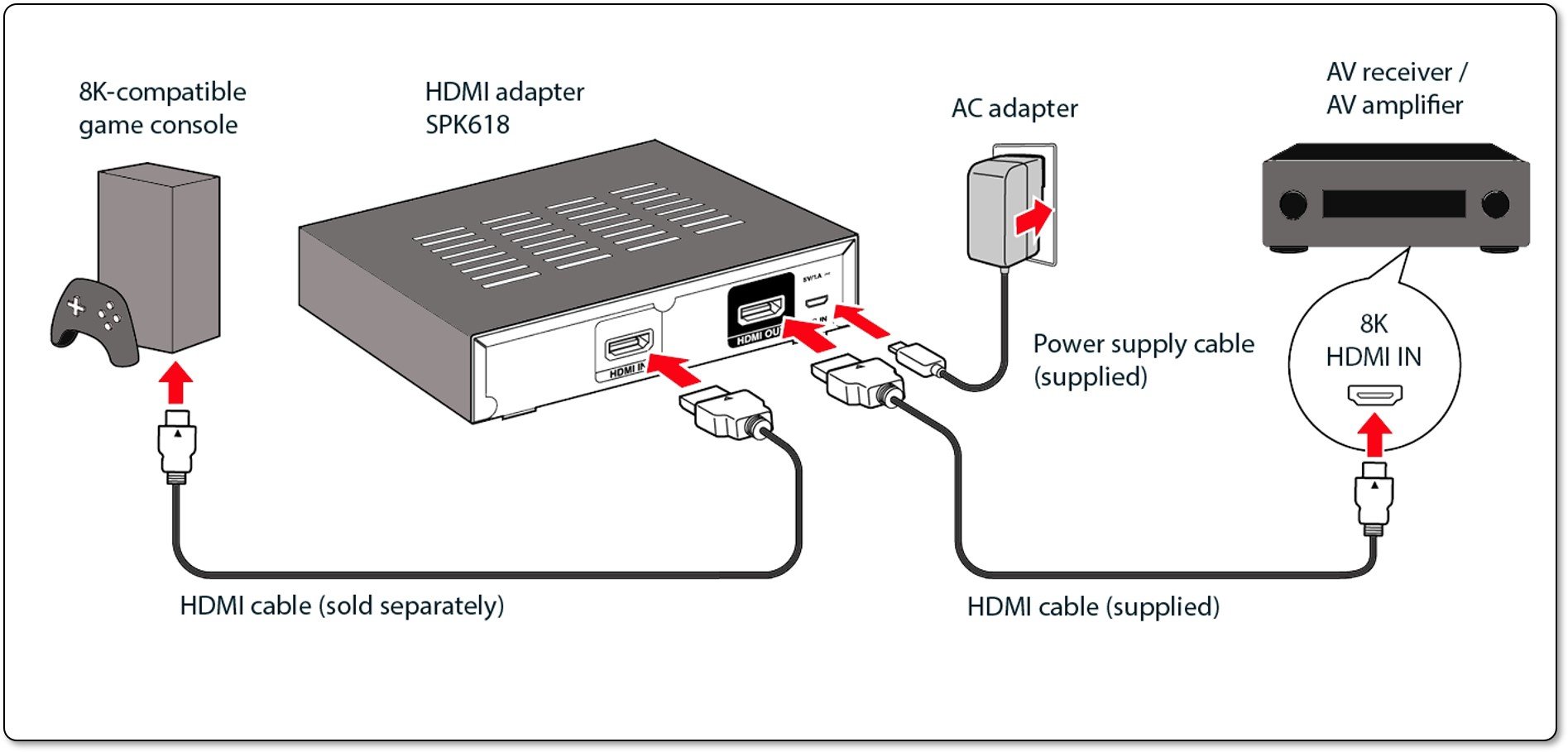 Az SPK618 HDMI adapter a 4K/120Hz és 8K videofelbontást támogató egyes Denon A/V Receiverek (az alább felsorolt konkrét modellek) és a 4K/120Hz és 8K videofelbontású kimenetet támogató játékkonzolok közötti kompatibilitási probléma orvoslására szolgál.