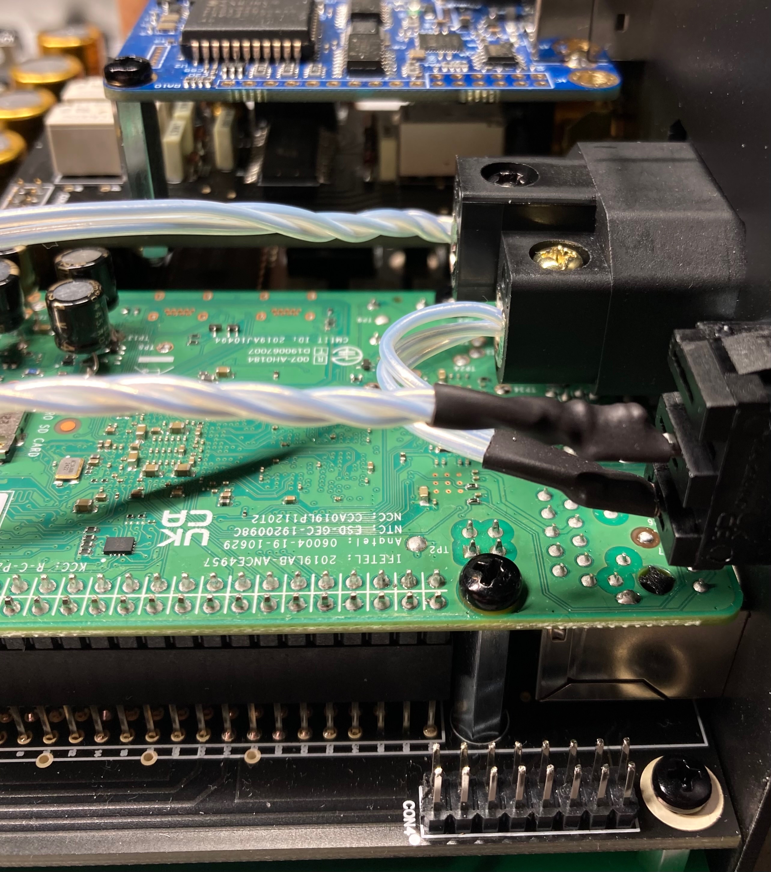 - minden részegység külön tápkörrel rendelkezik: Egy külön transzformátor és egy külön tápkör tartozik a Raspberryhez. Egy külön transzformátor és két tápkör a digitális/analóg átalakító digitális áramköreinek, egy tápkör az usb modulnak és egy az spdif modulnak. Egy külön transzformátor és két tápkör pedig az átalakító analóg áramköreihez és a kimeneti analóg szűrőhöz. Ezeken felül pedig még külön tápkörök vannak szeparált panelen a távirányítóvevőnek, kijelzőnek és a világításnak.