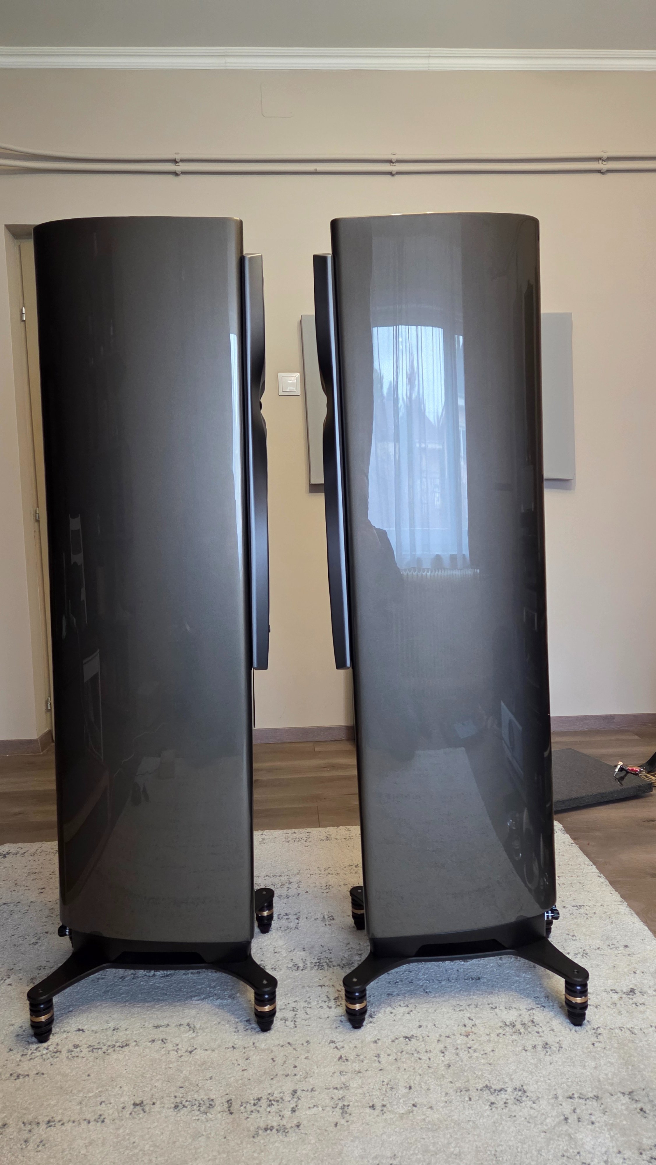 Az egyiken van egy minimál karc, ezt fotóztam. A hangsugárzók a gyári tüskékkel kerülnek eladásra, megtekinteni Érden lehet, csere most nem jöhet szóba.