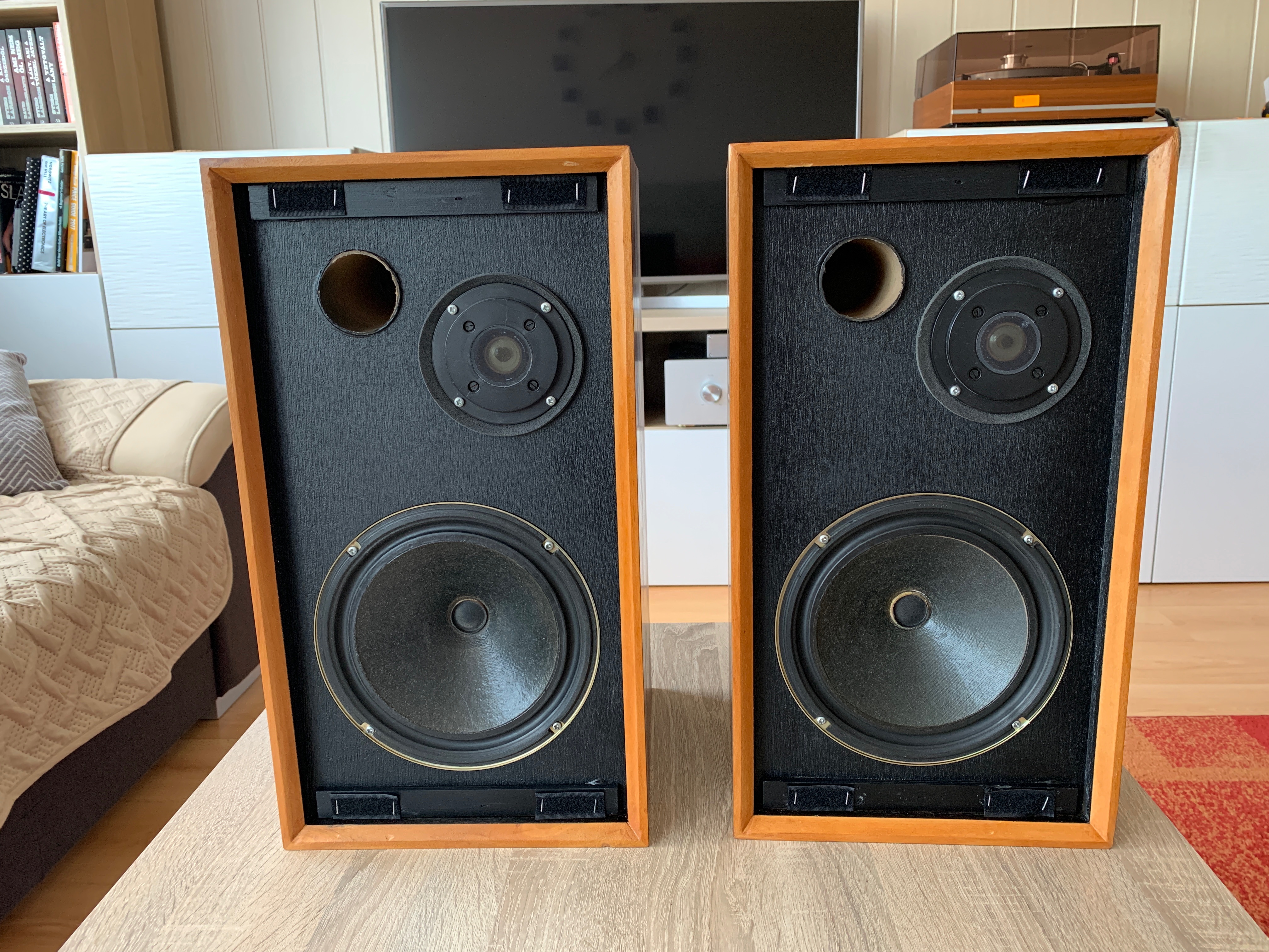 Eladó egy korához képest jó állapotú Goodmans Minister típusú hangfalpár. A hangváltókban a kondenzátorok Bennic-re cserélve, a belső kábelezése Van-Damme, valamint a gyári hangfalcsatlakozókat is cseréltem banándugósra, valamint a selyem is cserélve lett. A külső burkolata valódi fa furnér, nemrégen lett újralakkozva, az előlapokat is lefestettem feketére. Az eredeti lakkozáson sok karcolás és tüskék hagyta nyom volt, amiket fel kellett gőzölni, és vissza kellett csiszolni. Ennek sajnos áldozatul esett néhol a széleken a furnér, ezek azért látszanak is, de nem vészesek (a képek talán visszaadják).