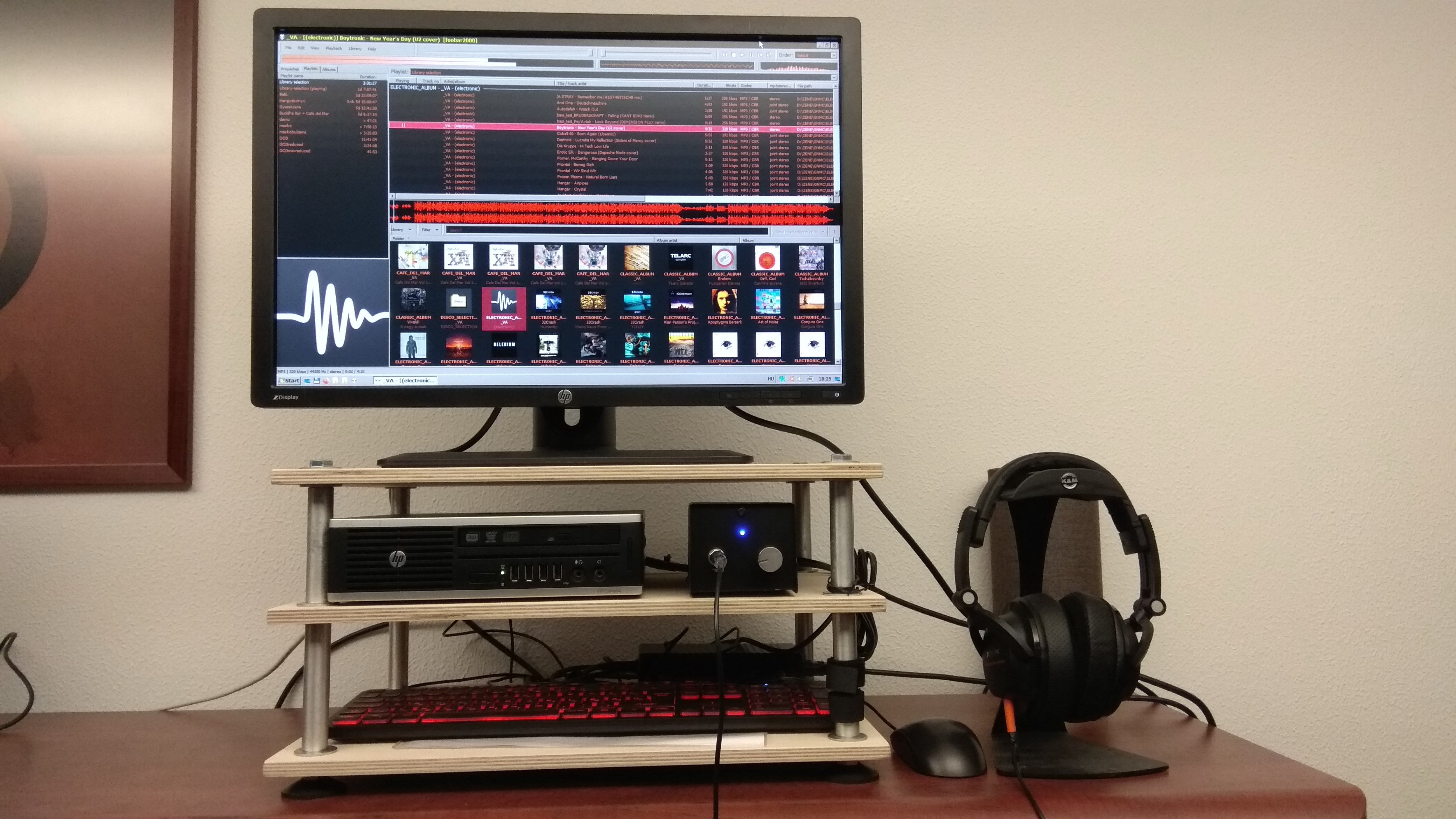 A képen látható "asztalosmunkák" saját magam által barkácsolt állványok. Az első egy egyszerű laptop tartó, amivel helyet lehet spórolni az asztalon (privát+céges laptop egyszerre szokott beletéve lenni). Persze ez normál billentyűre, egérre és monitorra van kötve (USB switch-el átkapcsolhatóan a két laptop között), és egy DragonFly Red hajtja a mellette lévő fejhallgatót. A jobb oldali komplexum pedig egy nagyon komoly szerkezet miniben, mégha nem is tűnik annak: mini projektor (akár mennyezetre is vetít, így fekve lehet nézni), média lejátszó (messze jobb a projektorba építettnél), 2TByte-os mobil HDD, és egy JBL GO kihangosításra - ha nagyon mobilnak kell lenni, egyébként természetesen DAC-ra, erősítőre és hagfalakra van kötve.